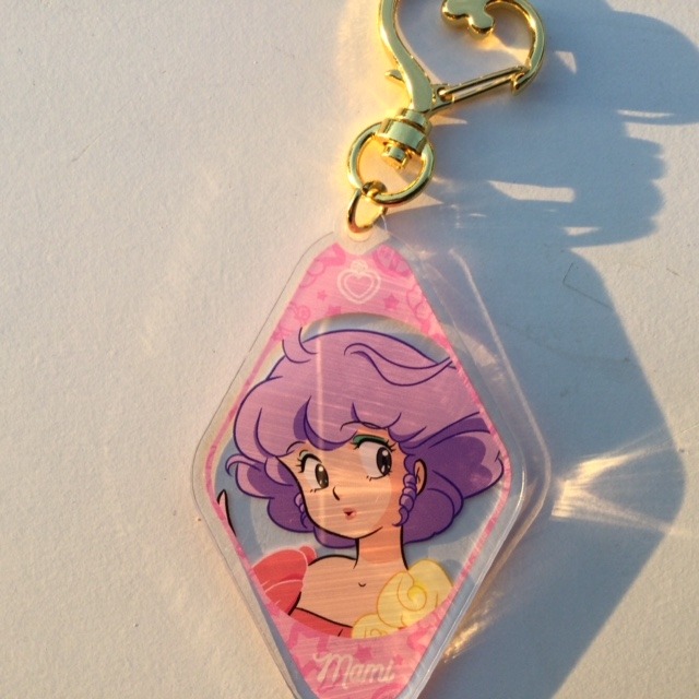 Porta chiavi a forma di rombo con gancio a forma di cuore. Personaggio: Creamy con vestito rosa e fiori gialli. Originale giapponese. Nuovo.
