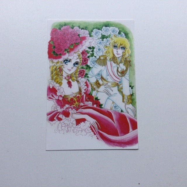 Cartolina. Personaggi: Oscar in uniforme bianca e Maria Antonietta con abito rosa. Dimensioni: 15 x 10,5 cm. Originale giapponese.