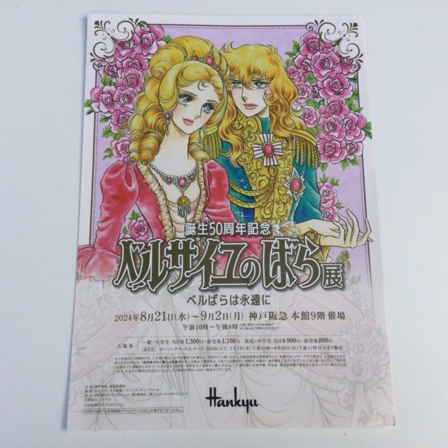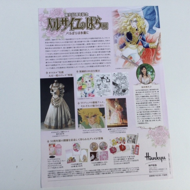 Flyer realizzato in occasione del 50esimo anniversario del manga. Personaggi: Oscar in uniforme blu e Maria Antonietta. Sul retro un breve riassunto dalla pubblicazione del manga ai giorni nostri. Dimensioni: 21 x 30 cm. Originale giapponese.