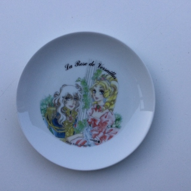 Piatto in ceramica bianca. Personaggi: Oscar in uniforme blu e Maria Antonietta con abito rosa. Dimensioni diametro: 16,5 cm. Originale giapponese.
