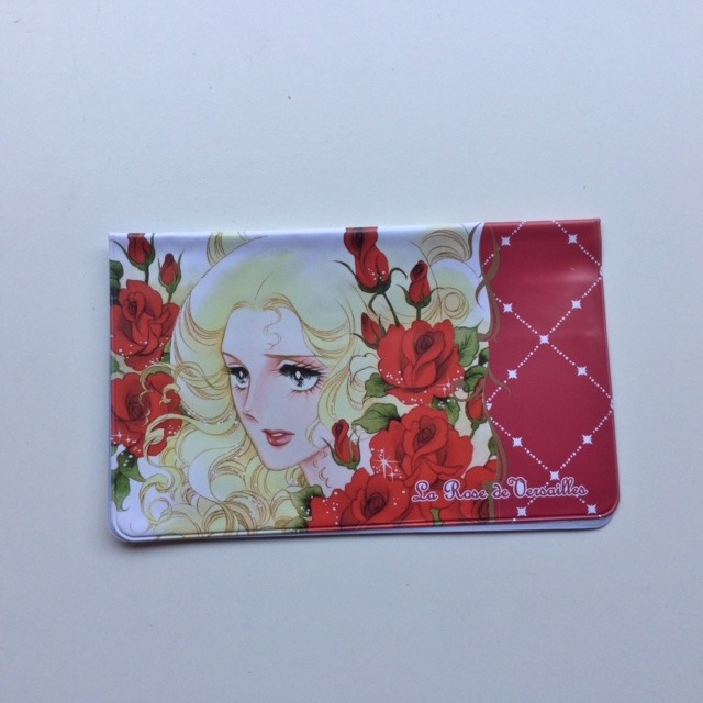 Portatessere con 5 scomparti. All'esterno, su un lato Lady Oscar in divisa blu e sull'altro Maria Antonietta con rose rosse. Misure: 20,5 x 16,5 cm. Materiale: vinile. Nuovo. Originale giapponese.