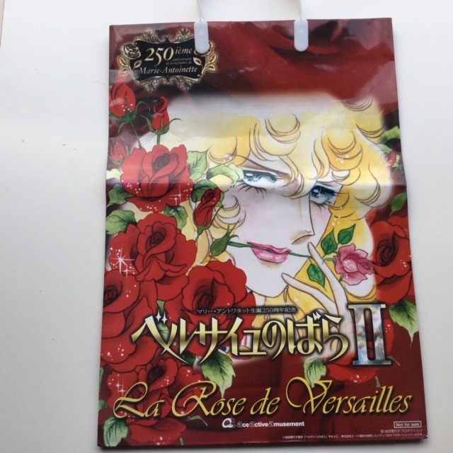 Sacchetto. di plastica con manici realizzato in occasione dei 250esimo anniversario della nascita di Maria Antonietta. Sfondo: rosso. Dimensioni: 46 x 32cm. Personaggi: Oscar circondata da rose rosse. Originale giapponese.
