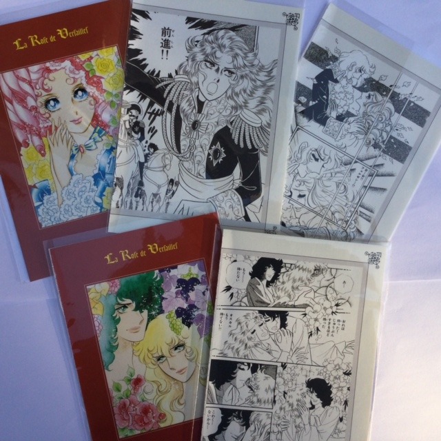 Set di 5 tavole: 3 in bianco e nero e 2 a colori. Personaggi: Oscar, André, Maria Antonietta e Hans Axel von Fersen. Dimensioni: 15 x 10 cm. Originale giapponese.