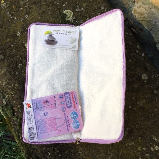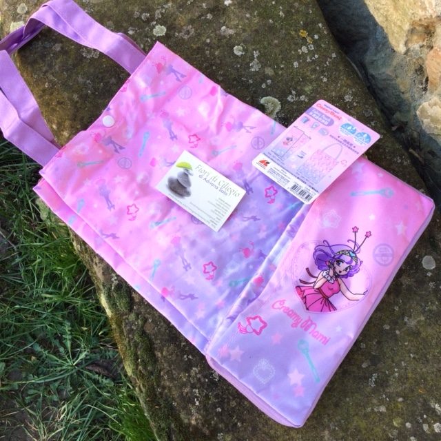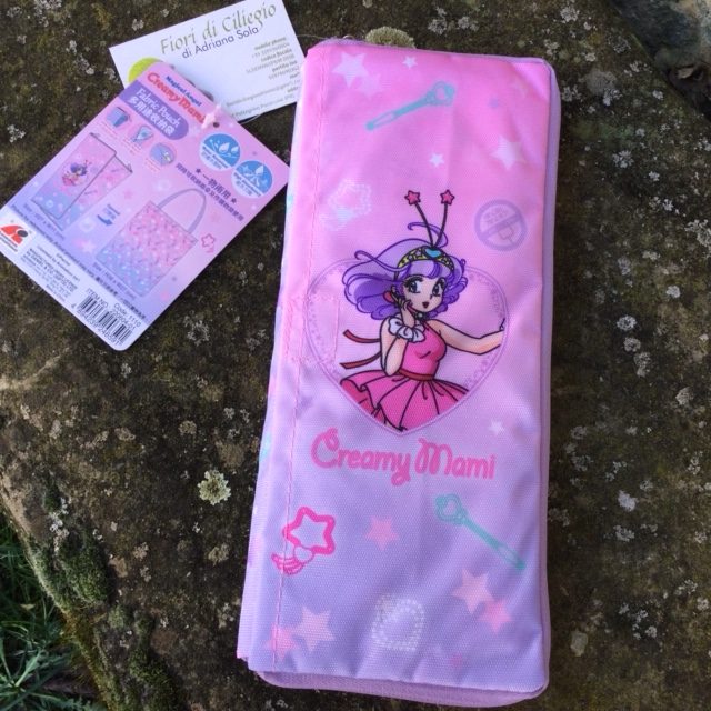 Porta ombrello (ombrello piccolo ripiegabile) che si apre a libro, lungo i due lati, e all'interno è ricoperto di un tessuto in spugna per asciugare l'ombrello. Sul lato esterno della borsa c'è una tasca in cui è riposta la shopper, in tela cerata che misura 36 x 22 x 10 cm. Prodotto a Hong Kong su licenza Studio Pierrot nel 2022. Nuova.